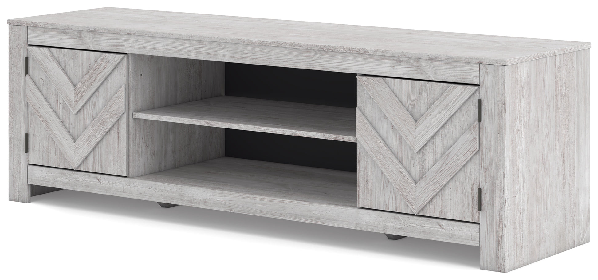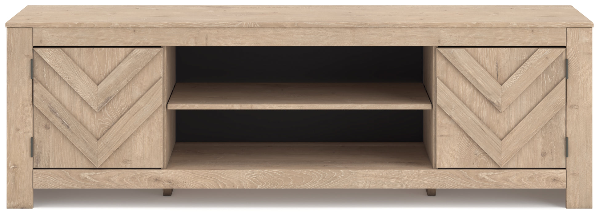 This TV stand embraces a classically charming aesthetic and repurposes it for modern living. Its dark charcoal finish to your love of vintage character, while the chic chevron pattern is effortlessly on trend. And with hidden storage behind the doors, your media accessories stay tucked away in style.