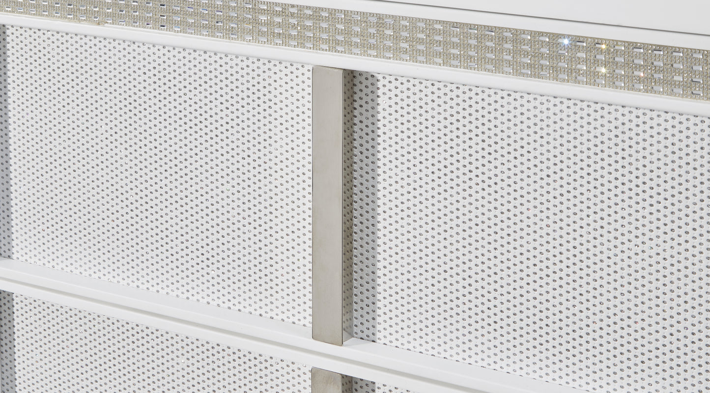 - Drawers with rhinestone frames; textured laminate drawer fronts