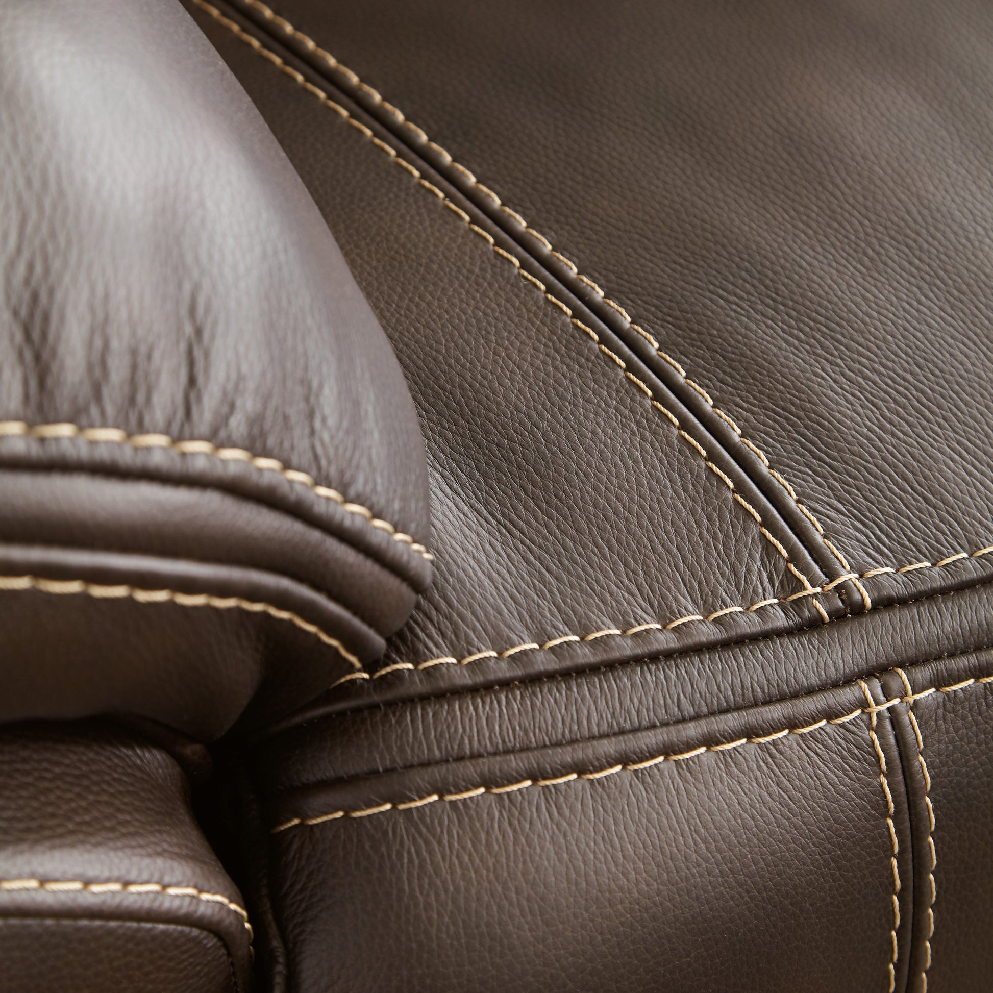 Load up on comfort in a cool, clean-lined and contemporary way with this power reclining sectional in chocolate brown. Rest assured, the expertly matched leather and faux leather upholstery is enriched with a pebble grain effect for authentic appeal and enhanced with jumbo stitching for dramatic contrast. It features a one-touch power control with adjustable positions, along with an Easy View™ adjustable headrest that allows a primo view of the TV even when you're reclined. Extended ottomans provide extra length for leg comfort. A zero-draw USB plug-in at your fingertips lets you charge up as you chill out.