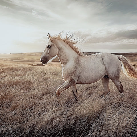 This wall art brings serene beauty to your home. This captivating print on glass captures the grace and majesty of a wild horse galloping through a golden field. The warm, earthy tones and dynamic composition create a sense of freedom and movement. It's a perfect choice to enhance your wall decor with nature-inspired artistry.