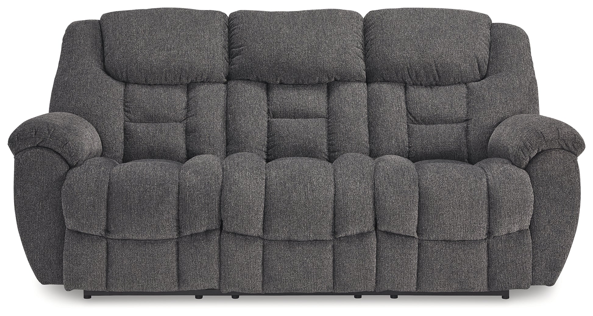 Sometimes seeing is believing. And you can rest assured that this reclining loveseat with console is every bit as indulgent as it looks. Designed to put you in the lap of luxury, the generously scaled seating—wrapped in a wonderfully plush and practical charcoal gray Next-Gen Nuvella™ upholstery—sports pillow-wrapped armrests and curvaceously cushioned head-neck support for feel-good flair.
