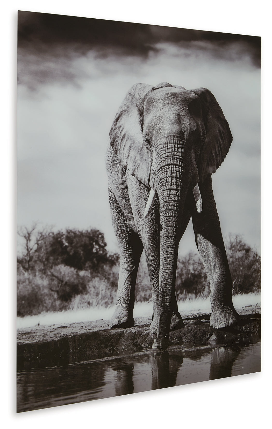 The elephant has long symbolized strength, intelligence and good luck. Celebrate this majestic creature and express your personality with this wall art. The black and white print on glass makes a bold and visually striking statement.