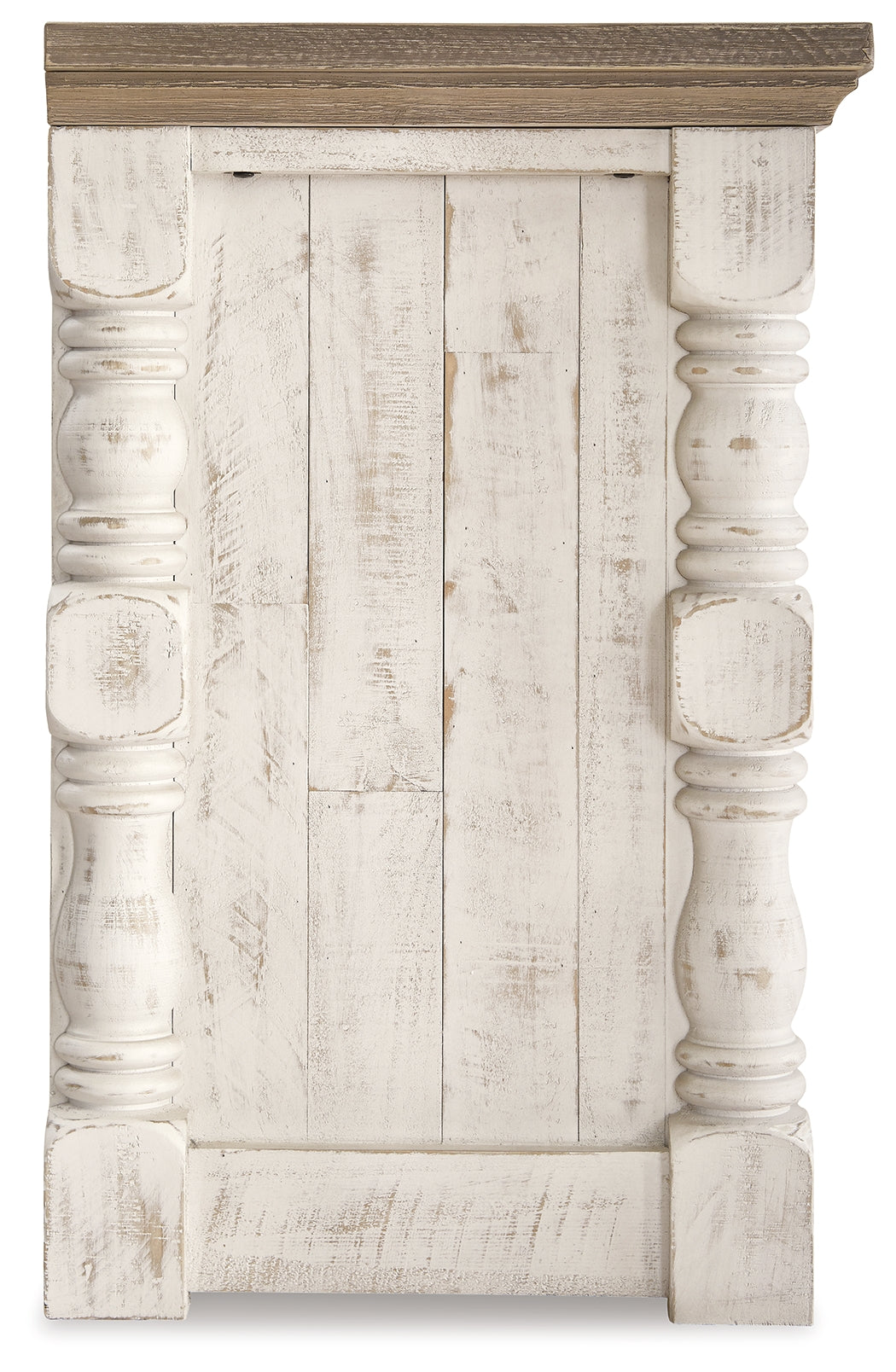 - Two-tone distressed finish: weathered gray top; vintage white base