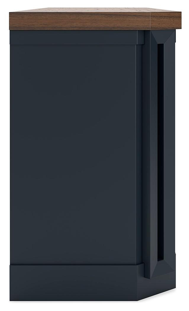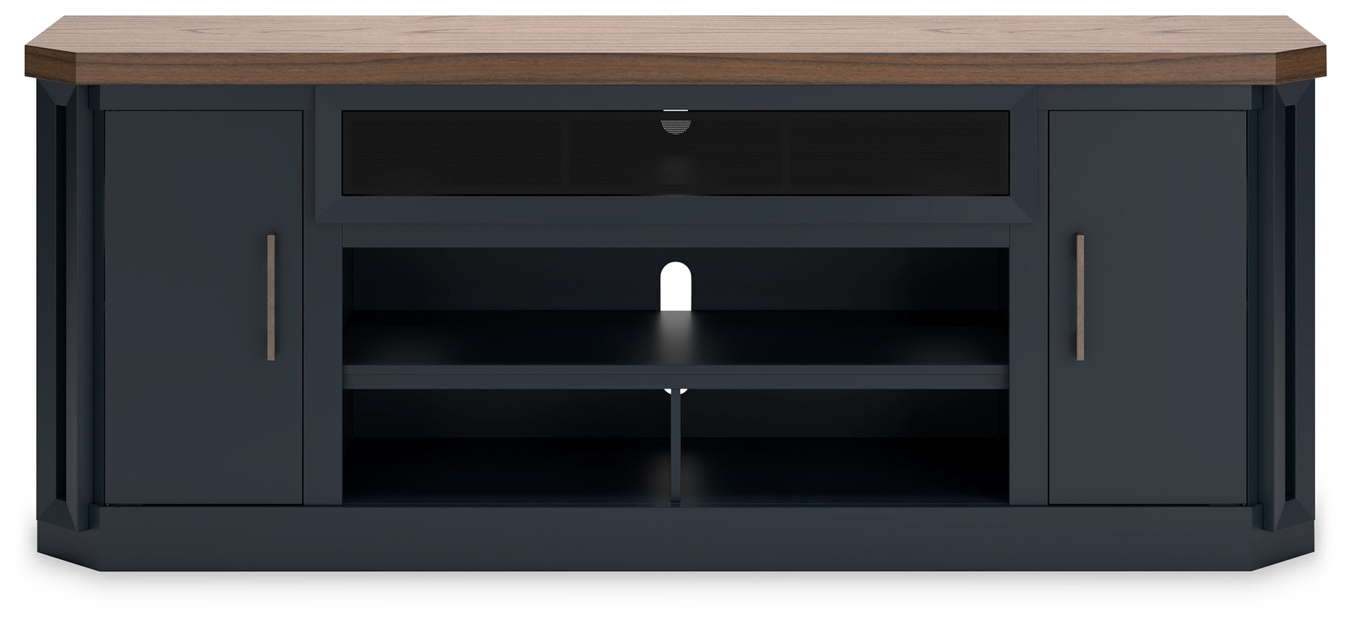 This TV stand combines casual contemporary design with modern appeal. Its combination of a thick-bodied wood-tone top with a slate blue cabinet is a smart choice on so many levels. Stow away electronics in the roomy cabinets, and use the upper shelf to conceal a soundbar speaker for a clean integrated look. Enhancing the experience: the optional fireplace insert (sold separately) brings a touch of warmth and beautiful ambiance to your living room.
