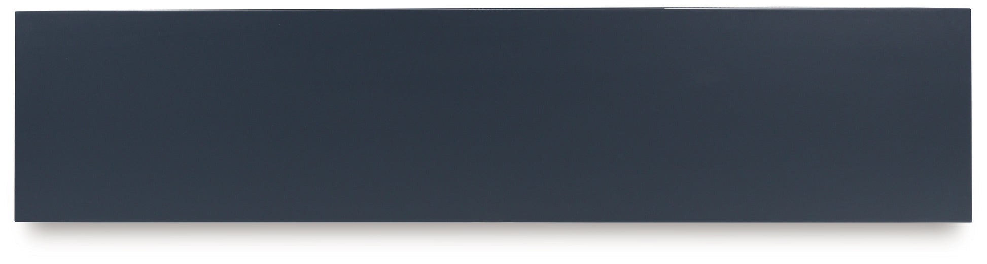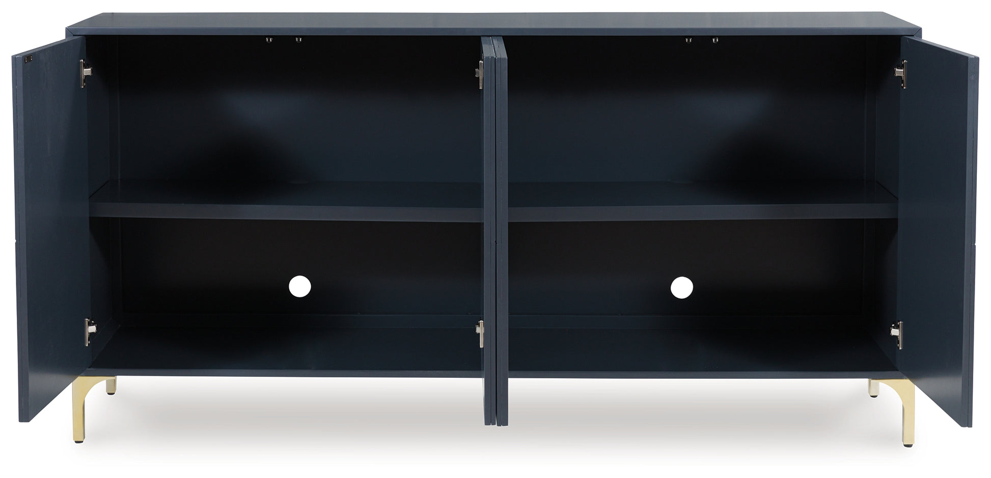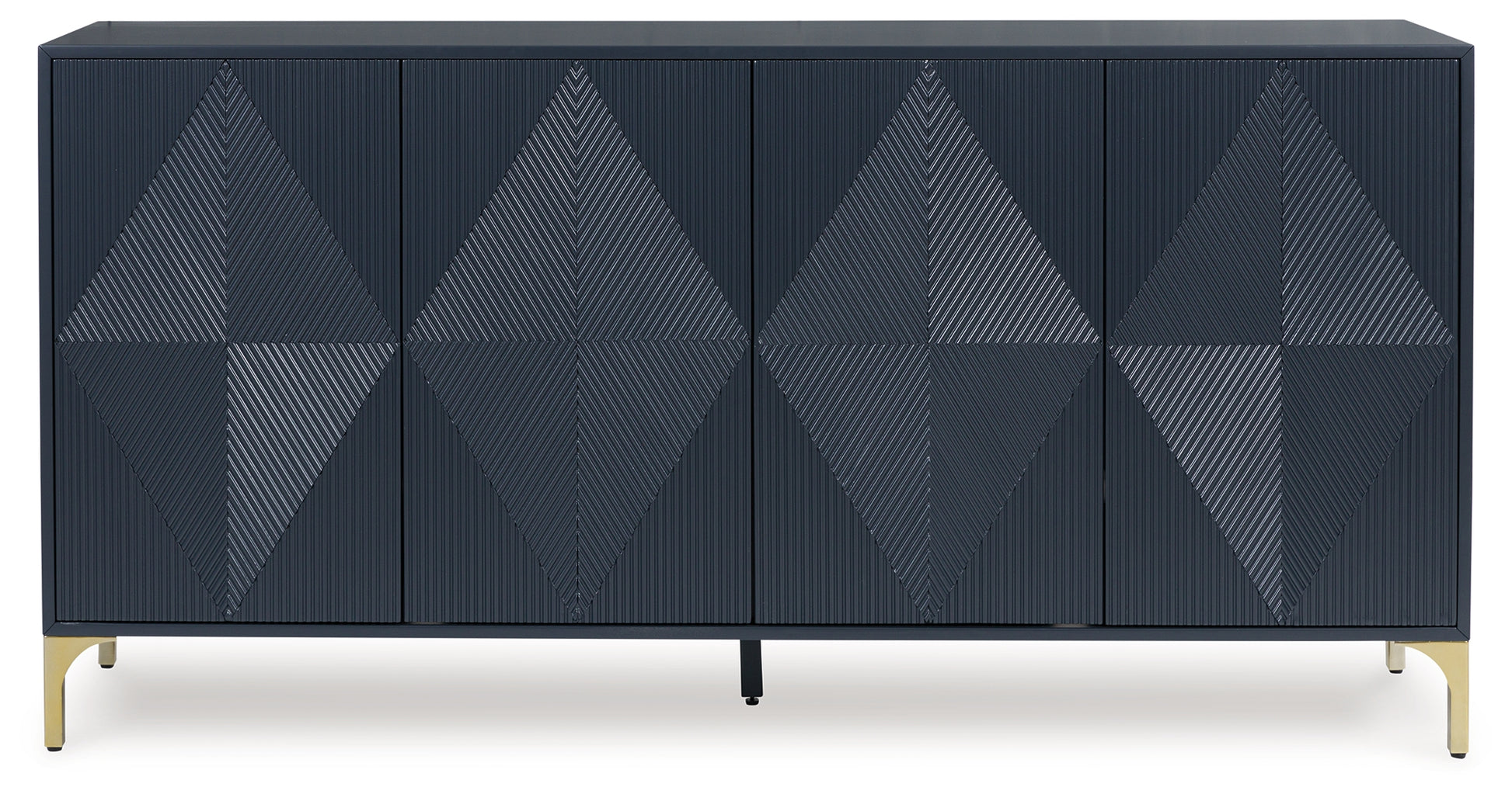 Elevate your aesthetic with the chic design of this accent cabinet. Sleek goldtone legs and striking doors with a geometric pattern infuse contemporary flair wherever you place this piece. Add a dark blue finish, and you've got a stunning showstopper. Providing function to form, the cabinet's push magnetic doors reveal two shelves and openings for electronics.