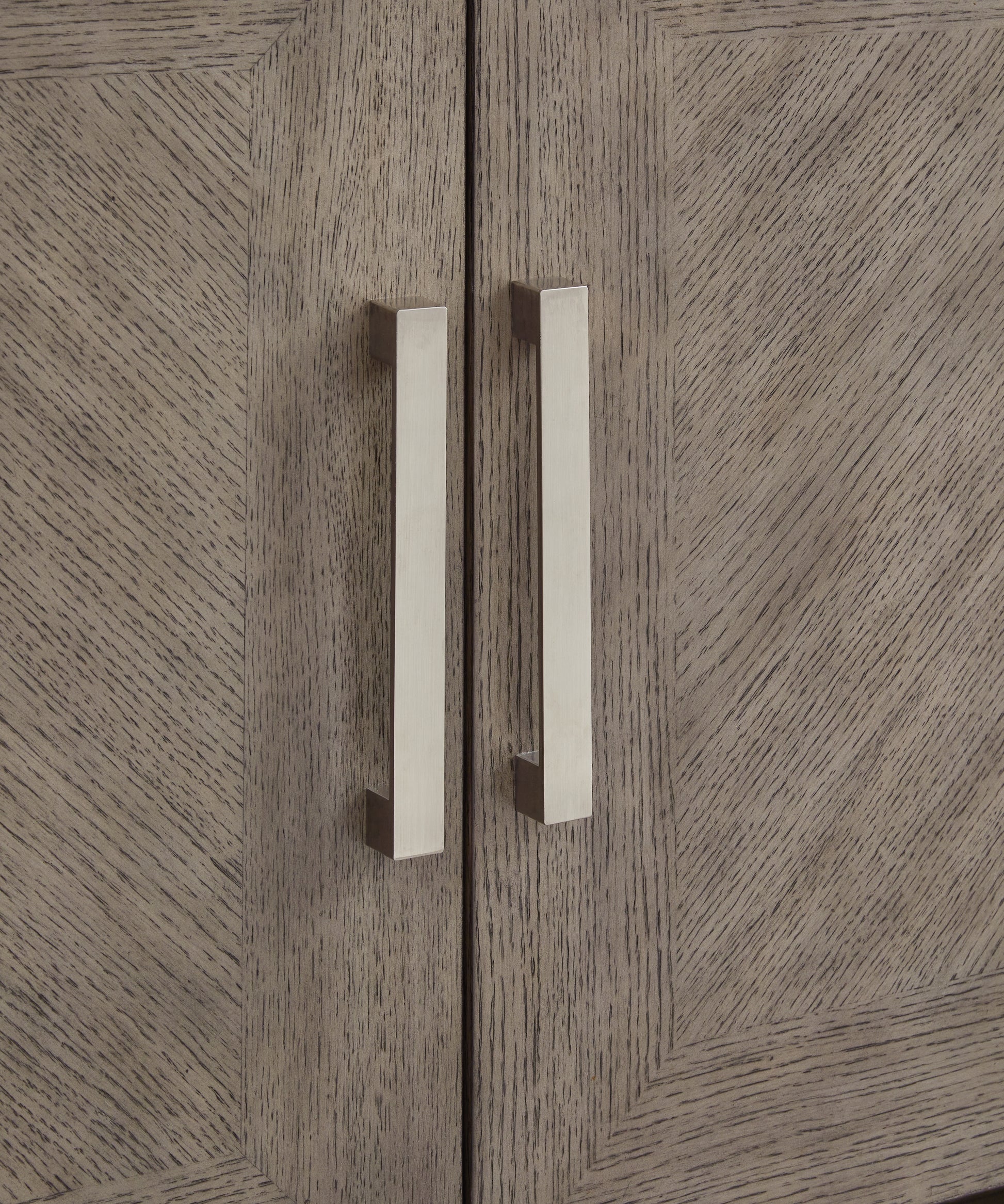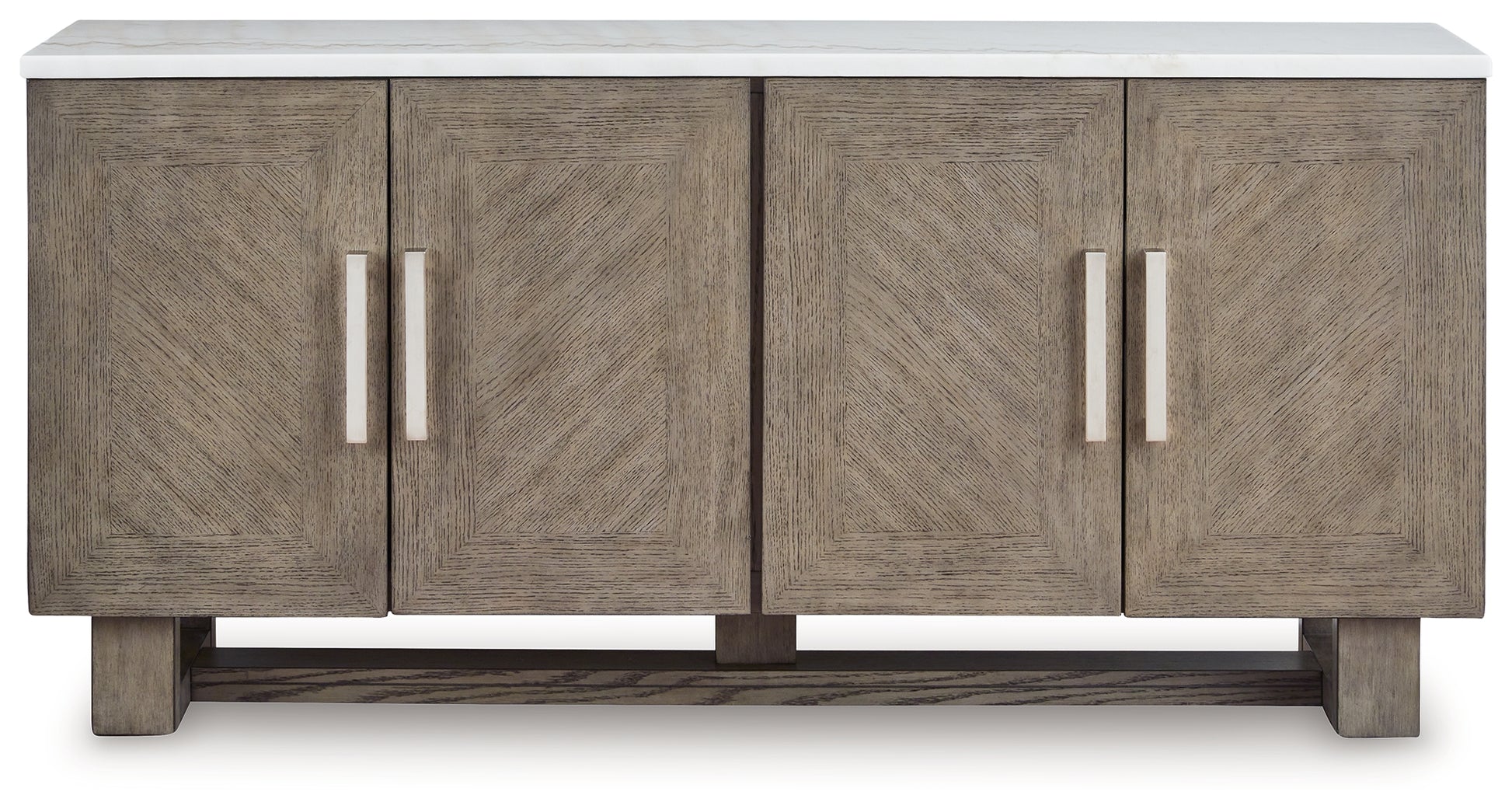 Welcome casual, contemporary style and functionality to your home. This TV stand delivers a mixed-material vibe with its white marble top and grayish brown finish, lending a laid-back look that’s so welcome at the end of a long day. Cabinet doors with framed chevron accents and large silvertone pulls add dimension and style. And there’s plenty of room to store entertainment accessories, with adjustable shelving and cord management holes for added convenience and versatility.
