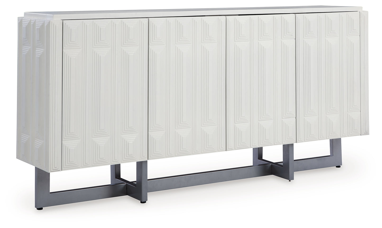 Keep things contemporary cool with the Ornawel accent cabinet. The step pattern on the door fronts lends an appealing geometric touch, with a lightly distressed white finish enriching the design. Touch latch doors open to reveal two shelves for all your storage needs. What a high-style statement.