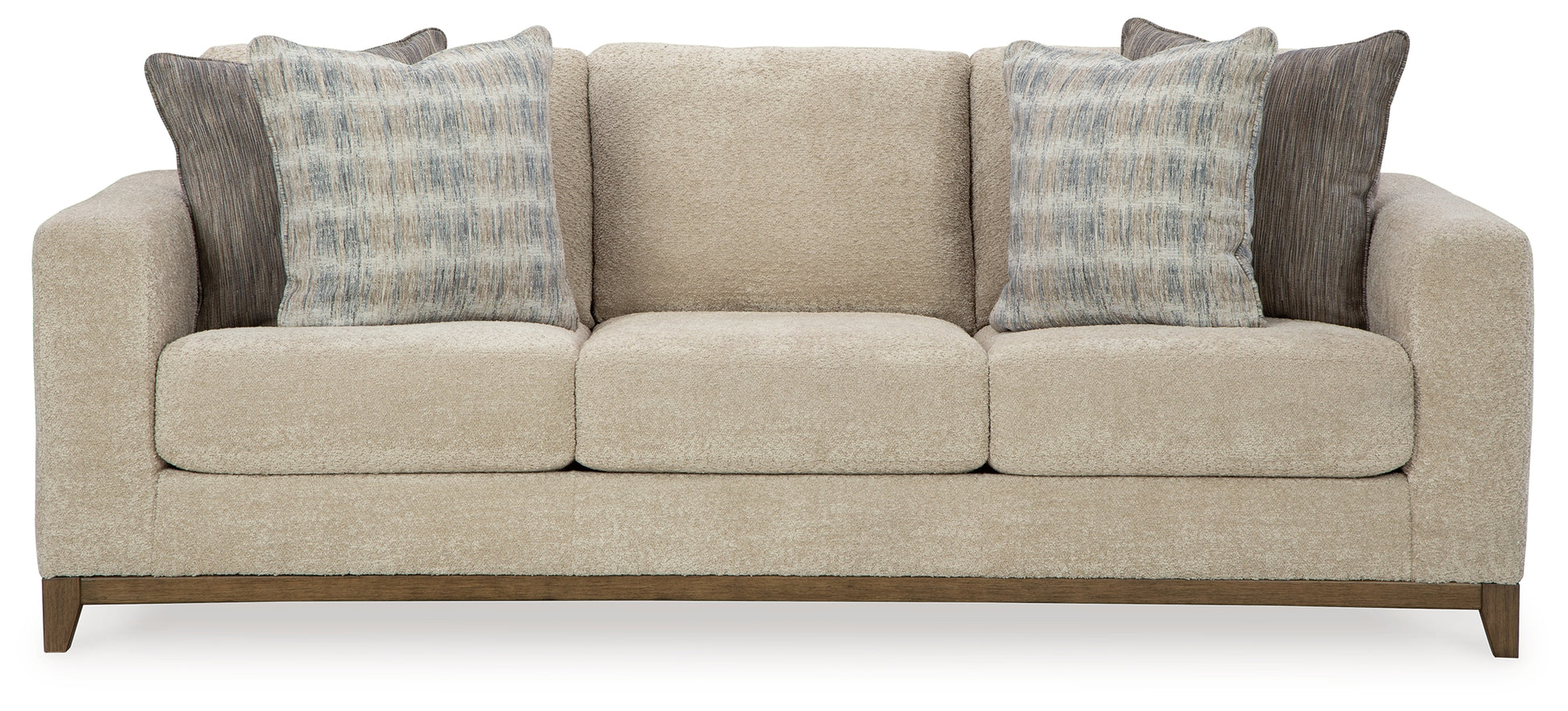 Serene style with a modern sensibility. Delight in the cozy, versatile embrace of this ottoman. It takes an on-trend approach to irresistible texture and natural beauty, showcasing soft upholstery accented with a transitional wood trim. As refined as it is laid back, the ottoman also keeps comfort a priority with a plush, thick cushion.