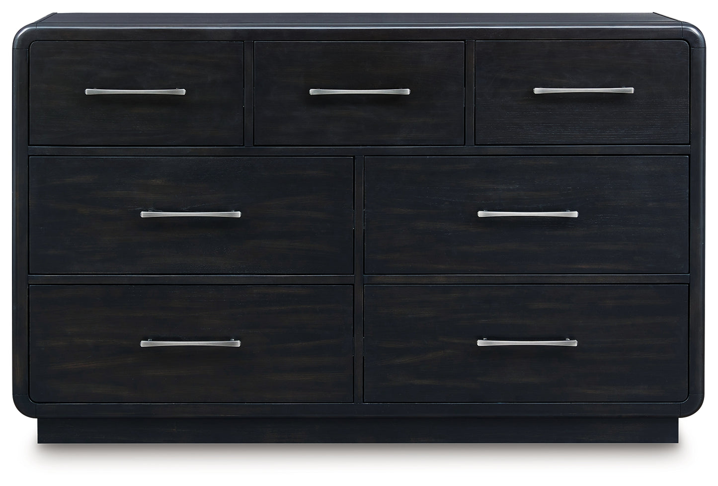 Inspired by art deco design, this softly shaped dresser with mirror makes a lasting impression in a simply stunning way. Its magnificent curved silhouette is enhanced by a rich layered black finish on the textured wood grain surface. This is the statement piece you’ve been dreaming of to elevate your contemporary inner sanctum.