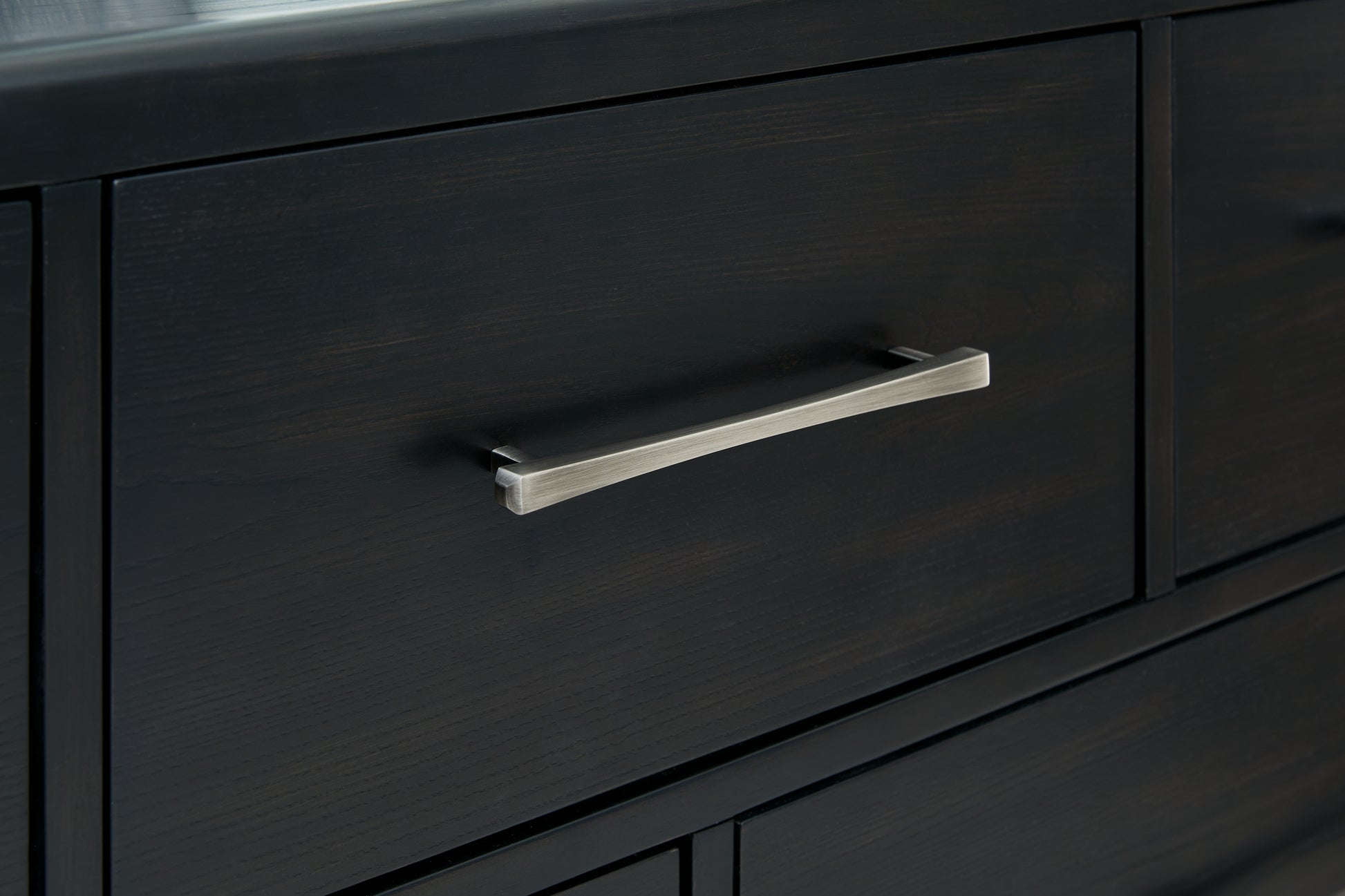 - Black finish on textured wood grain surface