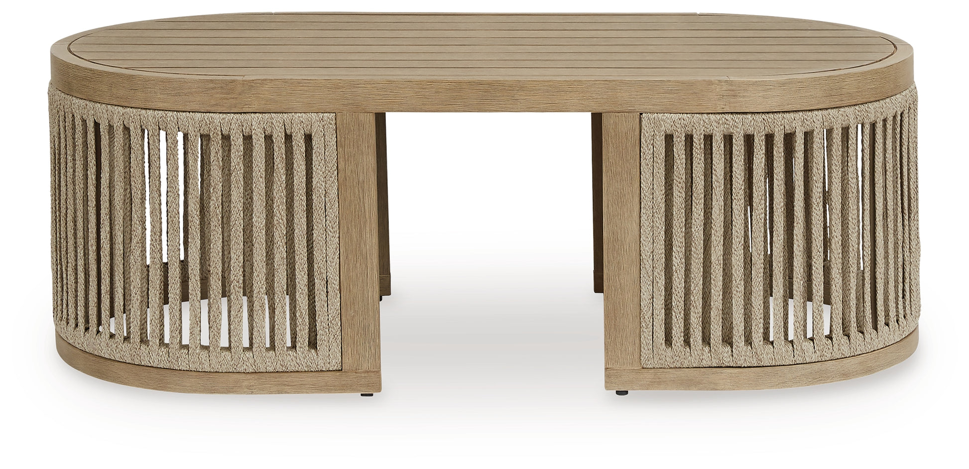 Round out your outdoor living space with the naturally beautiful look of wood. This cushioned sofa will serve up seasons of relaxation on your back deck or sitting pretty by the pool. The couch's gently curved, open-weave design is crafted from eucalyptus wood and polyester rope, for the perfect merger of high fashion and lasting durability. Plush cushions and accent pillows are wrapped in cleanable, UV-resistant Nuvella® fabric, making stylish living a breeze.