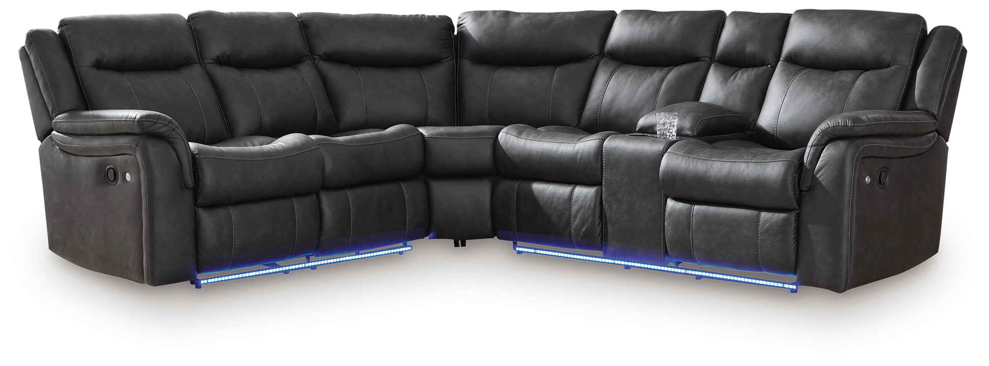 This reclining sectional pairs the luxe look of faux leather with must-have functional features. LED lights on the underside put a modern twist on the simply chic design—choose from three colors to add ambiance to movie night or gaming with friends. And you can keep remotes, drinks and other entertainment essentials close with the handy console. Ready to relax? Easy pull tab reclining has you stretched out in no time.