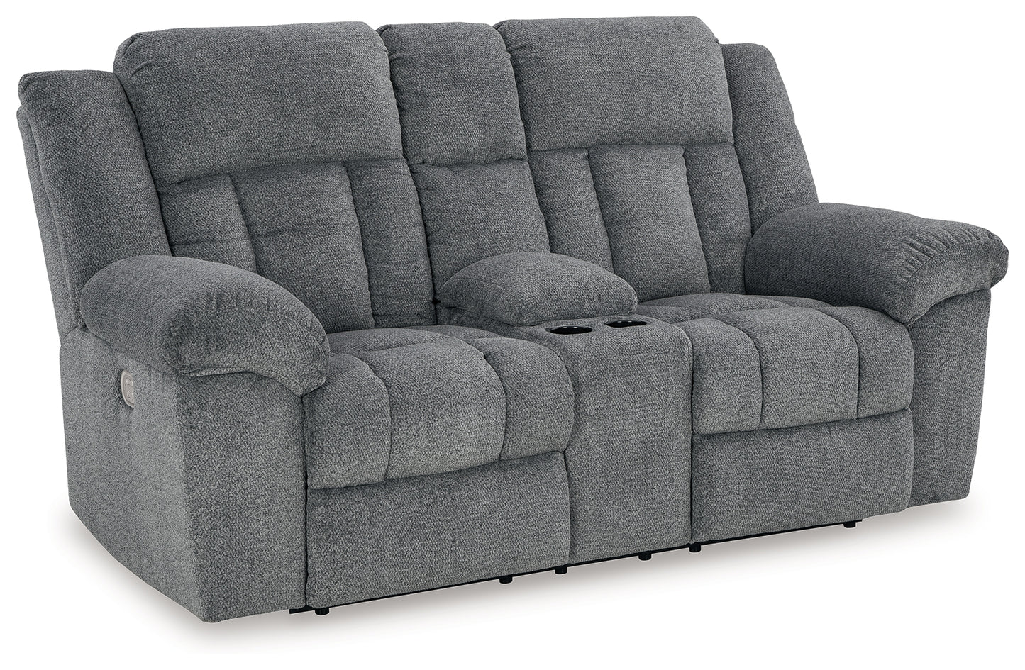 Big, bold comfort. Game time and movie nights meet their match with this power reclining loveseat. Made for ultimate indulgence, an extra-deep seat encourages you to sit back and bliss out. Customize the recliner and headrest to find your ideal viewing position with effortless one-touch controls. And with plush upholstery in a trendy hue, you won’t need to sacrifice style for cozy seating.