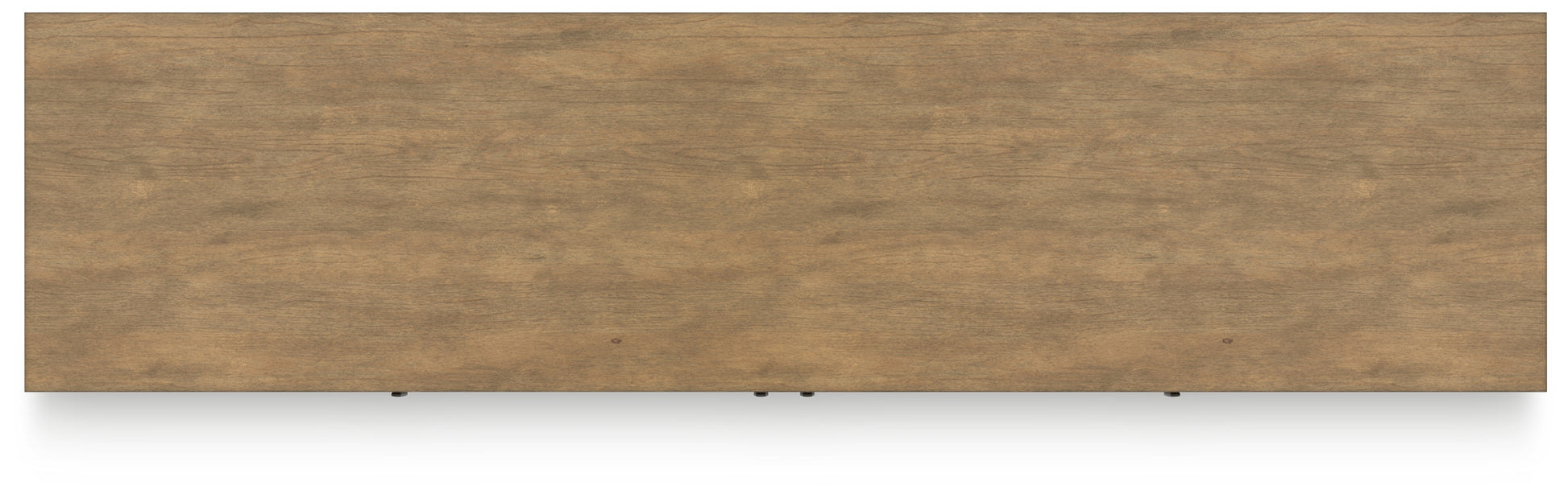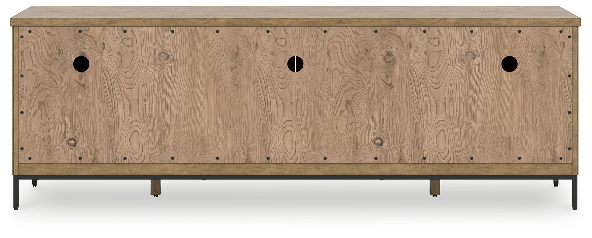 Made for the everyday, this TV stand is a sleek complement to your casual contemporary living room. You’ll love the refined-yet-relaxed vibe of its contrasting medium brown finish and matte black legs. Concealed and glass-front cabinets make media storage a breeze. And for added function, cord management holes throughout the piece make connections easier.