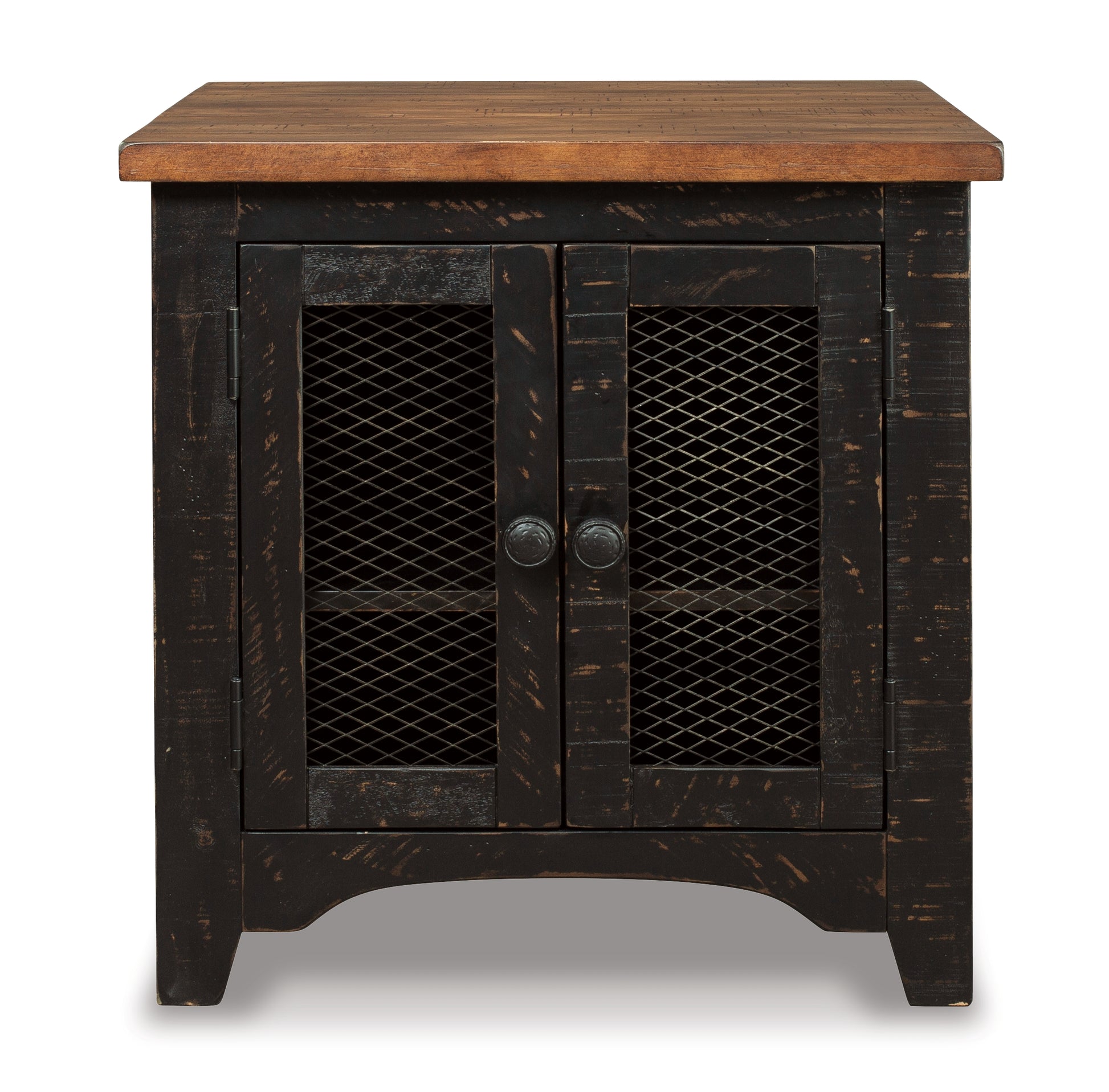 To those with an eye for the best in rustic farmhouse living, this two-tone end table doubles up on charm. Designer touches include plank-effect styling, distress marks and wire mesh door fronts for added character.