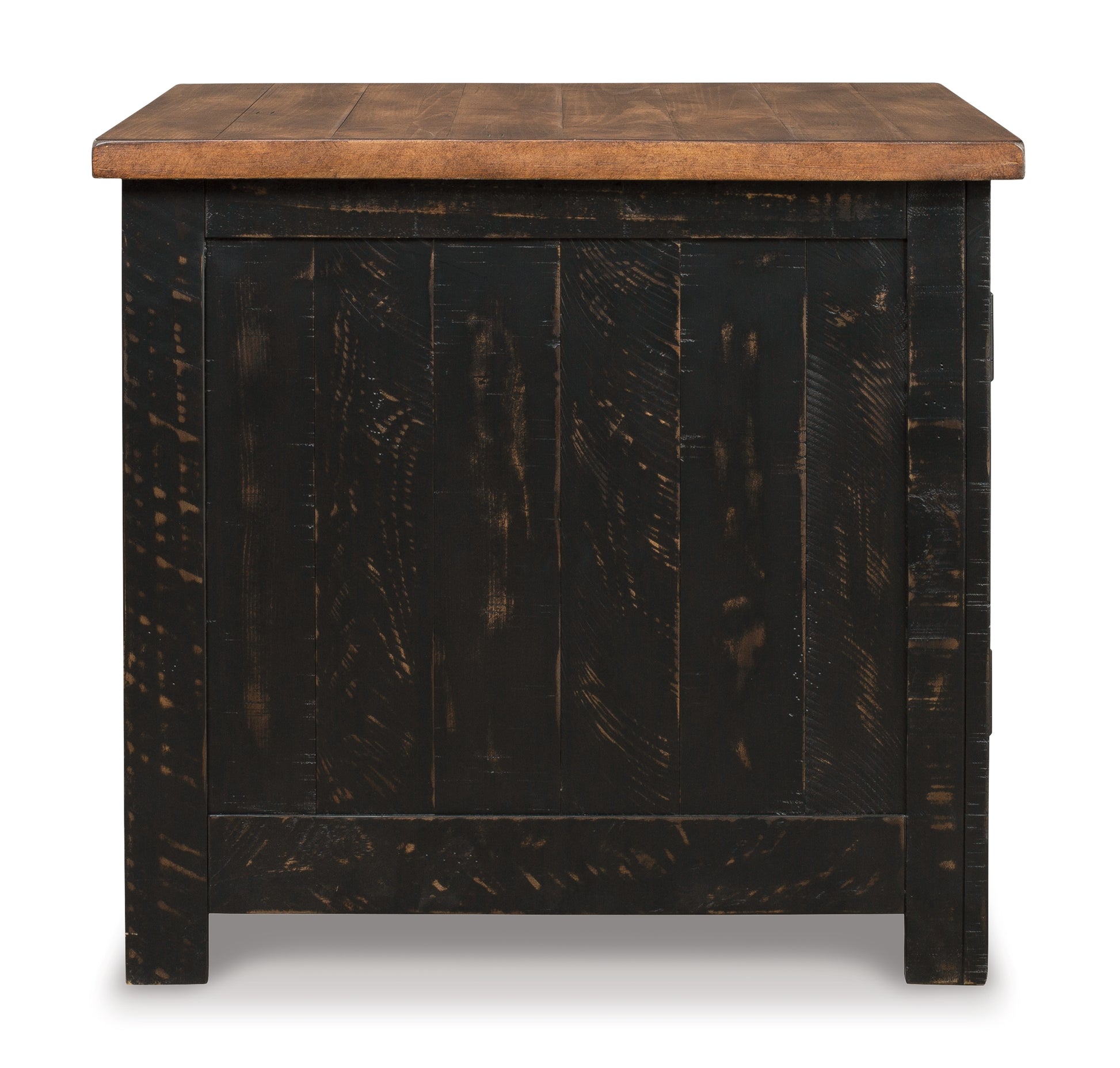 - Two-tone distressed finish (light brown top and rustic vintage black base)