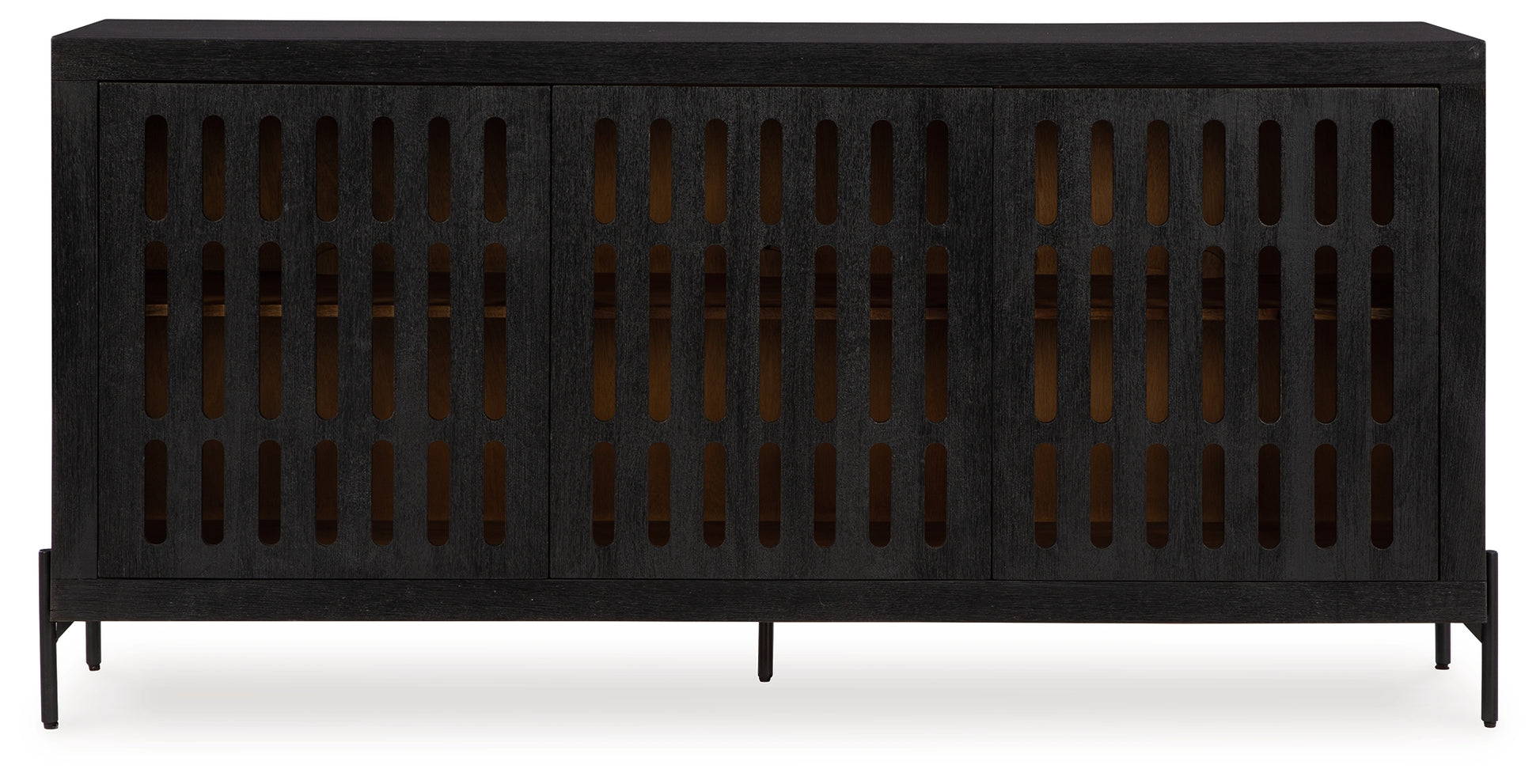 This accent cabinet showcases high-end style with a captivating design. A cleverly placed cutout offers a sneak peek inside, making it a versatile choice for use as a buffet, console or media cabinet. Contemporary and casual, this piece epitomizes laid-back luxury.