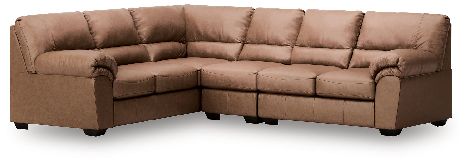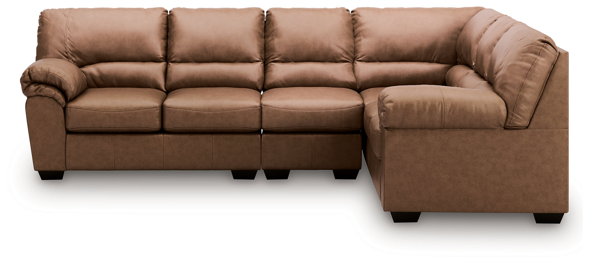 Modern comfort never looked so good. Sporting supremely soft yet durable cushions accented with high-fashion jumbo stitching, this stunning sectional is the ultimate choice in comfortably cool, contemporary style. Its umber-hued faux leather indulges with an upscale feel and wows like the real thing.